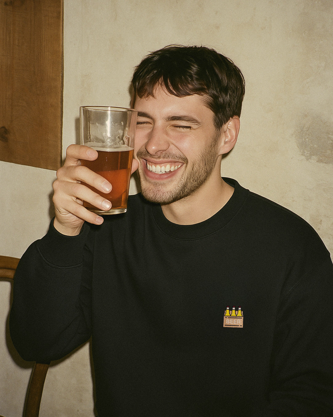 It’s a relaxed unisex beer crewneck—roomy enough for a base layer, clean enough to pass the “meet-the-parents” test. True-to-size for a casual fit; size up once for intentionally oversized. Sleeves sit right, hem doesn’t ride, and it won’t turn into a crop top after laundry roulette. We show it on multiple body types with height/size callouts so you can pick fast, not guess.