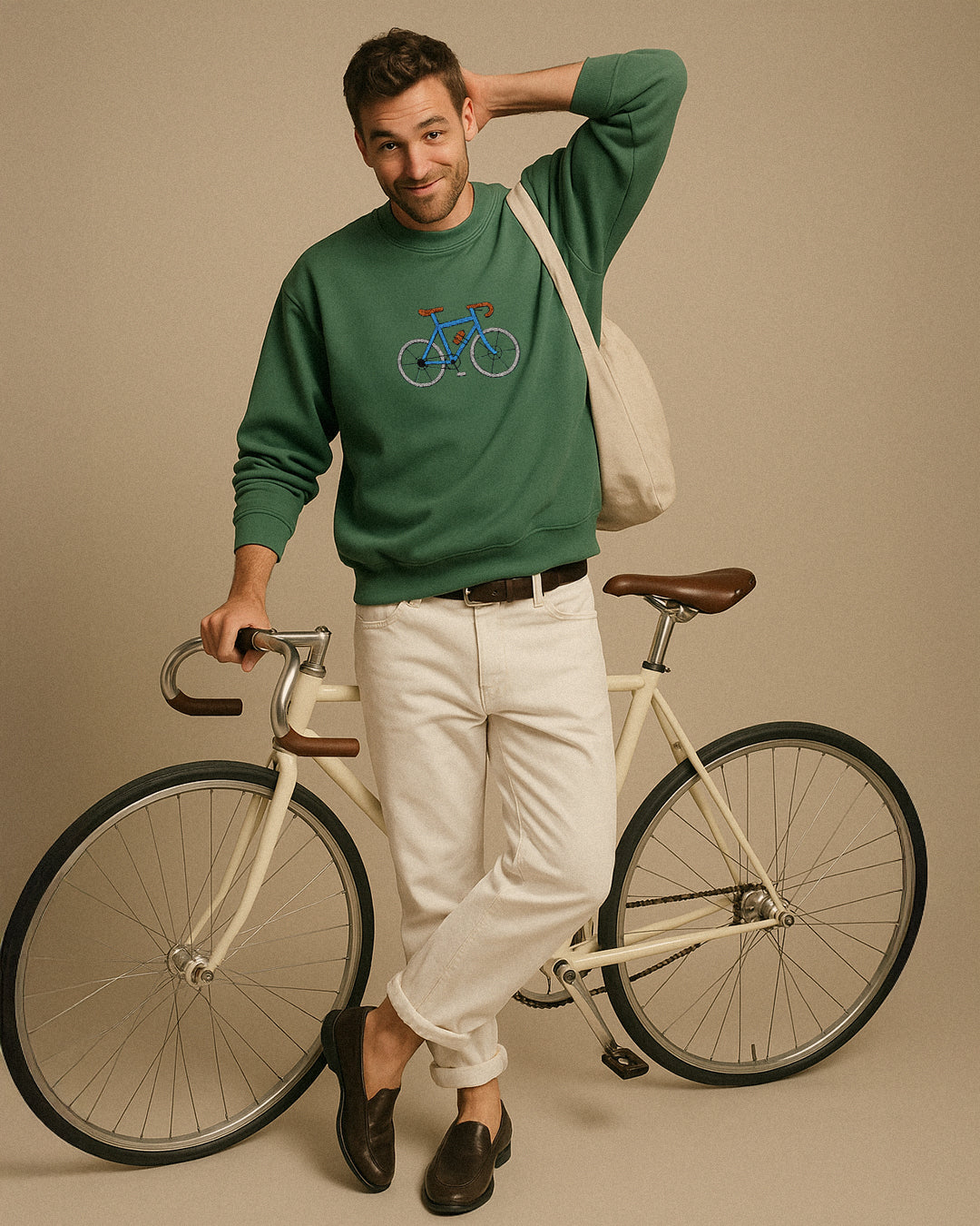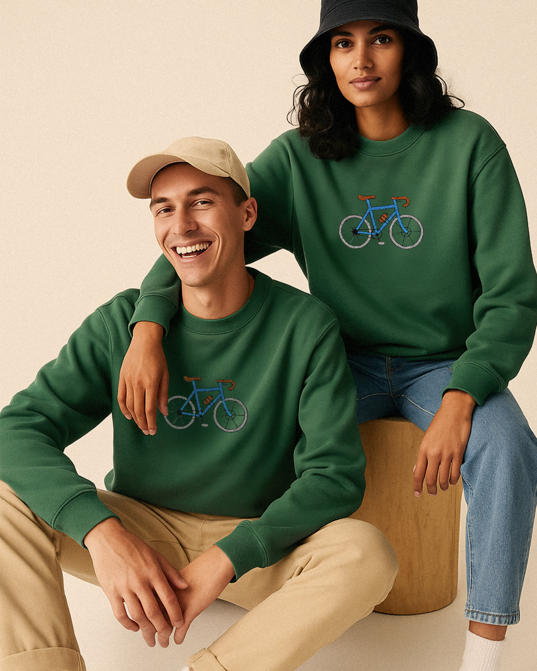 Embroidery gives depth, texture, and that subtle “this is nice” moment when someone catches the light on the stitch. It also outlives trend prints — fewer cracks, more compliments. If your closet is full of printed bike graphics, this embroidered bike sweatshirt will be the one that sticks around.