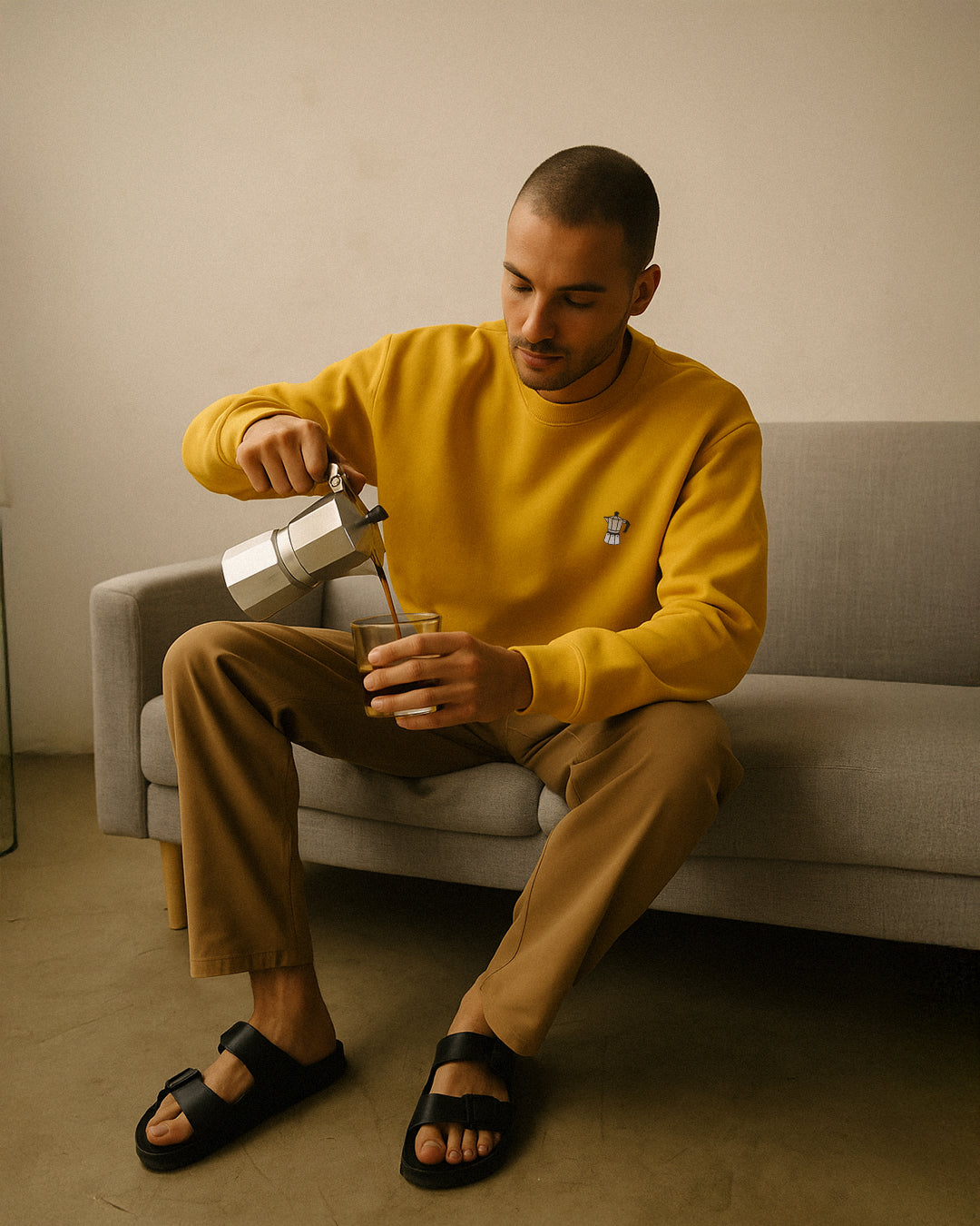 You’re looking at our Coffee Yellow Sweatshirt with Embroidered Moka Pot—a clean, minimalist take that still stands out across a room full of laptops and latte art. It comes in a warm yellow that pairs with black, denim, or winter neutrals. The embroidery sits “on the heart,” because that’s where the obsession lives.