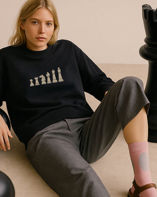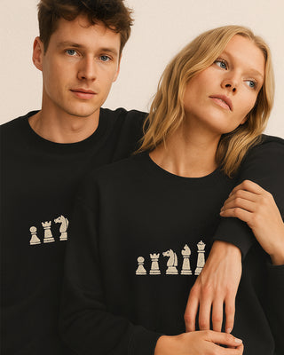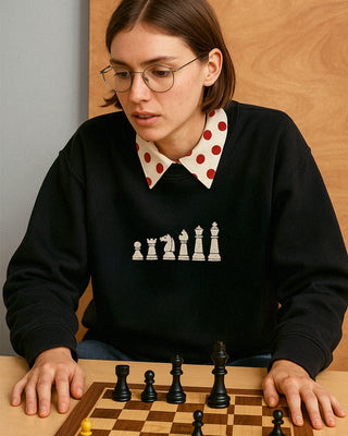 Für alle, die das Leben wie ein Strategiespiel spielen. Das CHESS Sweatshirt in Schwarz feiert Fokus, Geduld und dieses stille Selbstbewusstsein vor jedem Zug. Minimalistisch, zeitlos, mit einem gestickten Schach‑Set, das für sich spricht. Für die Denker, die Taktiker – die, die wissen, dass jeder Zug eine Geschichte erzählt.