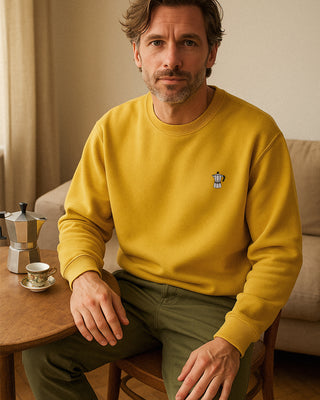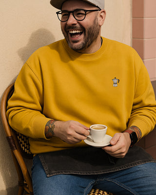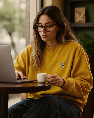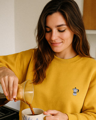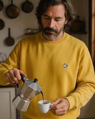 Para quienes no pueden empezar el día sin ese primer sorbo. La sudadera amarilla Coffee Moka captura el ritual: el aroma, el momento tranquilo antes del caos, la moka burbujeando en el fuego. Cálida, luminosa y con una moka bordada que lo dice todo. Para quienes se mueven por pasión, no solo por cafeína.
